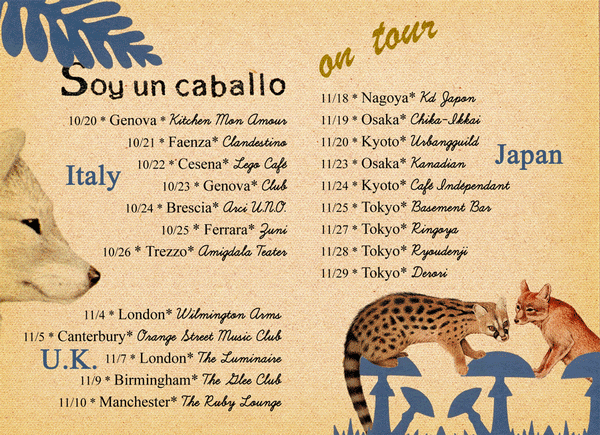 こんなライヴの知らせが届きました。 東名阪だけのようですが、 お近くの方は各会場のインフォメーションを チェックしてみてはいかがでしょうか。 moはどんくらい大きくなってるのだろう・・ ・・・と書きましたが、soy un caballoとは バンドの名前で、kateの友人だそうです。 早とちりしてしまいました。 でも、すごく素敵な音なので もしよろしければ行ってみてください。 http://www.myspace.com/soyuncaballo |